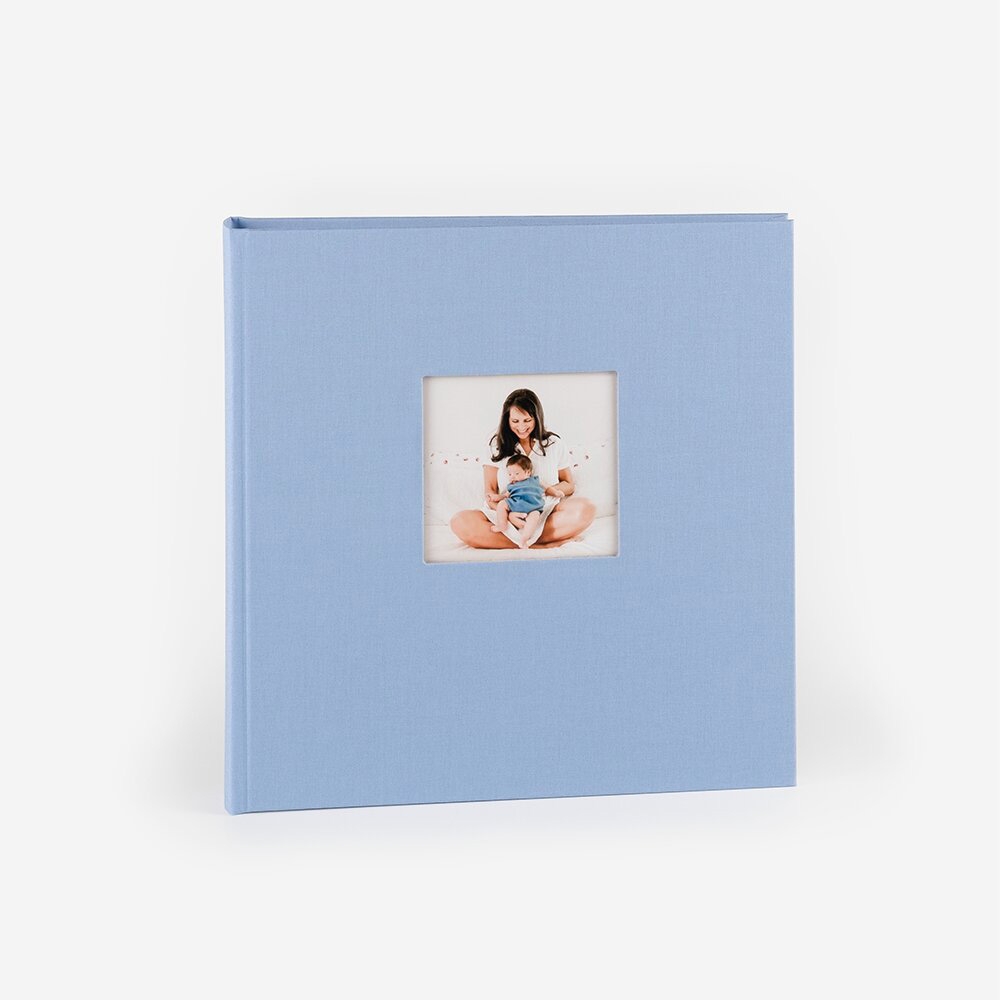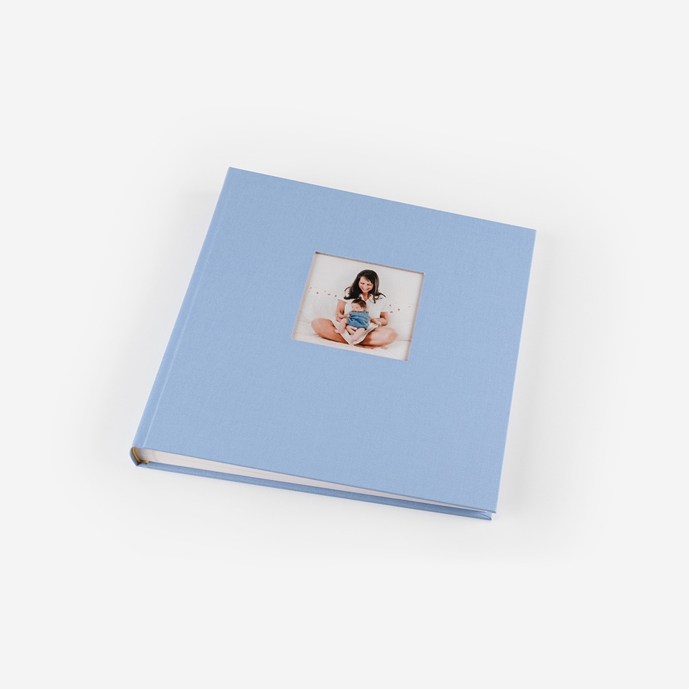 O álbum de fotos com janela para colar fotos tem folhas resistentes separadas por papel vegetal e capa de cartão resistente revestida de linho.