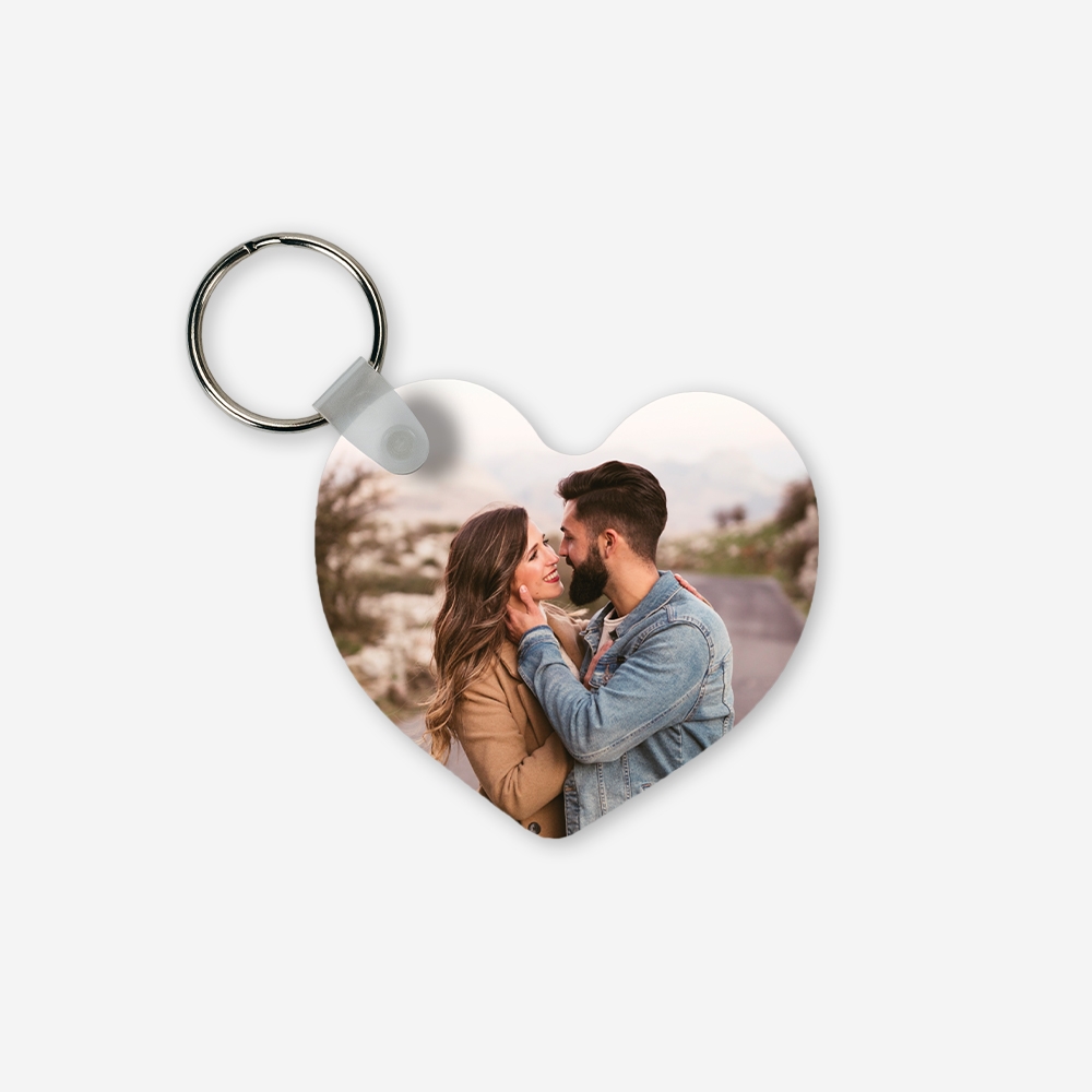 Com formato de coração e personalização total (100%) em ambas as faces, este porta-chaves transforma qualquer foto ou frase num presente romântico e inesquecível.