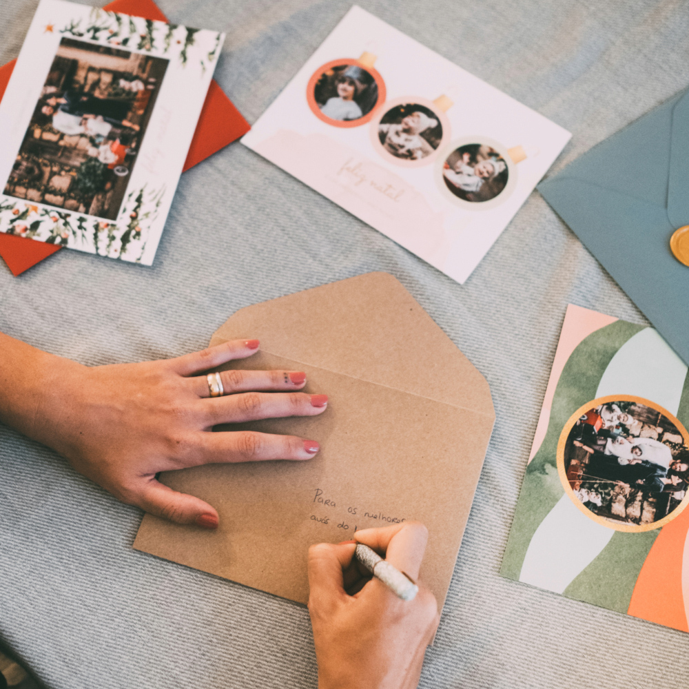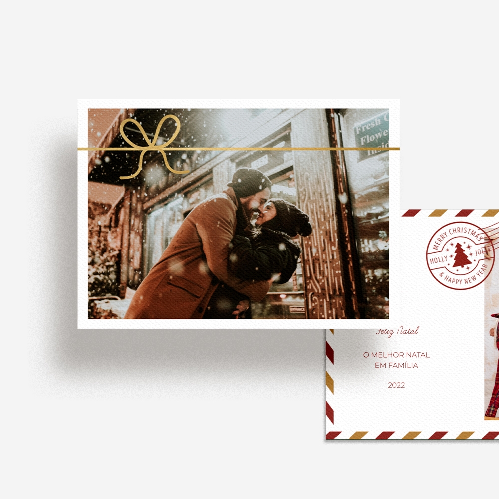 Os postais de Natal são um excelente complemento à surpresa que pretendes proporcionar aos teus familiares e amigos e para enviar às pessoas que infelizmente não podem passar o Natal em família por estarem longe, sobretudo aqueles que por razões profissionais residem noutros países. Nestes casos, os Postais assumem ainda mais significado, uma vez que conseguem levar algum conforto e amor, através das palavras e de fotografias. Podes criar o teu Postal de Natal de raíz ou escolher um dos modelos disponíveis no nosso editor online. Encontras vários temas com elementos de Natal diversificados, como a coroa natalícia, o pinheirinho, o simples ho, ho, ho e muitos mais. Podes aproveitar a tua foto favorita da sessão de natal para personalizar um postal e surpreender todos os familiares e amigos.
